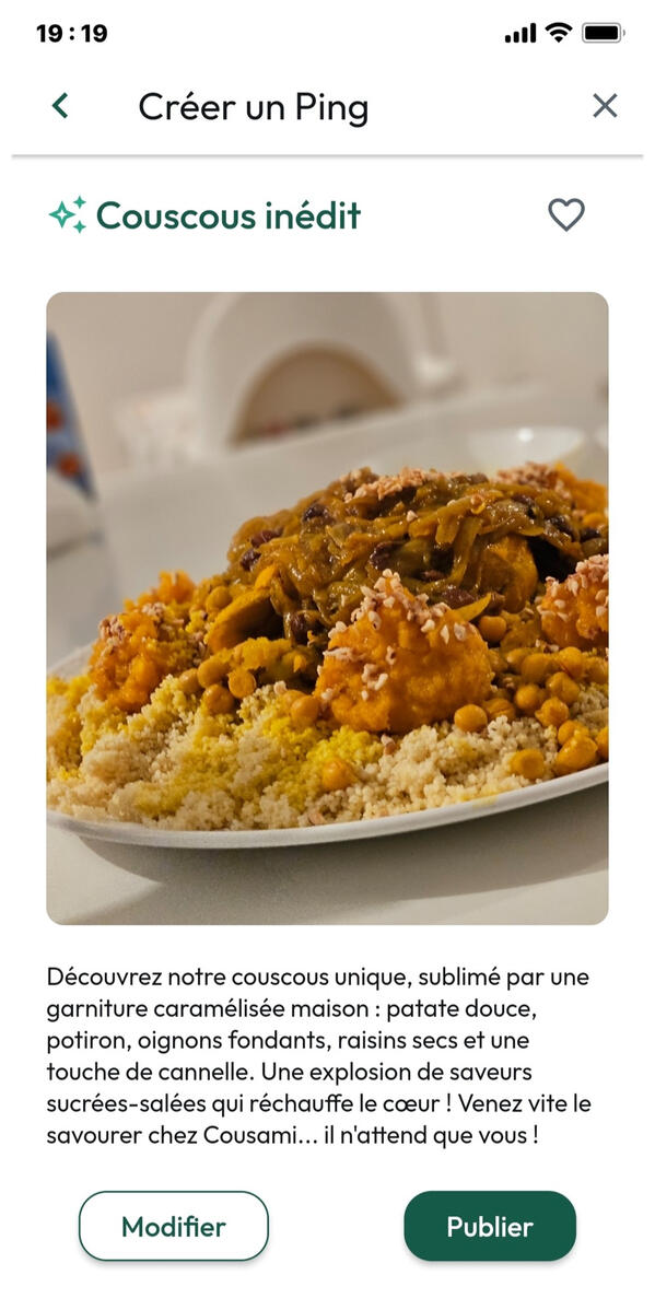 Vous avez la possibilité de publier jusqu'à trois pings par jour, avec une réinitialisation automatique toutes les 24 heures. Cela vous permet de régulièrement promouvoir vos offres ou événements, tout en maintenant un flux constant d'informations pour vos clients.